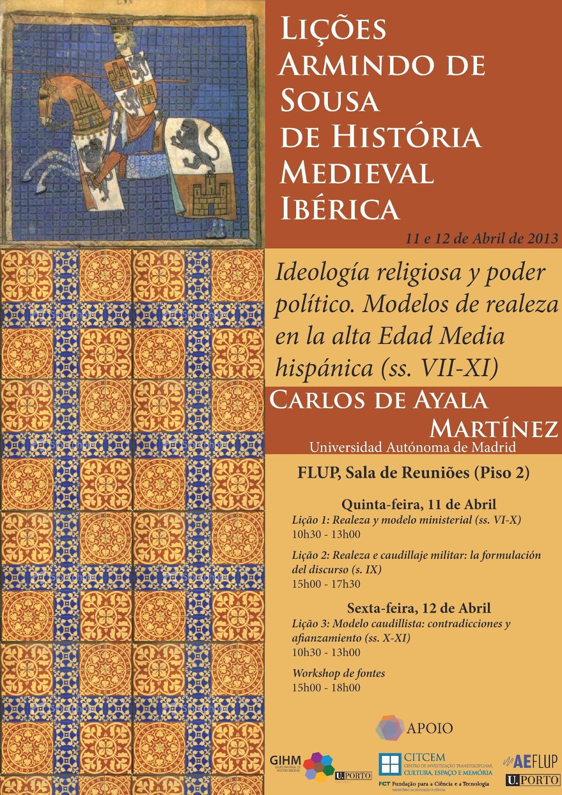 A segunda edição das “Lições Armindo de Sousa“ contou com a presença do conferencista convidado Professor Carlos De Ayala Martínez, da Universidade Autónoma de Madrid, que apresentou uma série de três lições magistrais e um workshop de fontes em torno do tema “Ideología religiosa y poder político. Modelos de realeza en la alta Edad Media hispánica“. As lições decorreram nos dias 11 e 12 de abril de 2013 na Faculdade de Letras da Universidade do Porto.